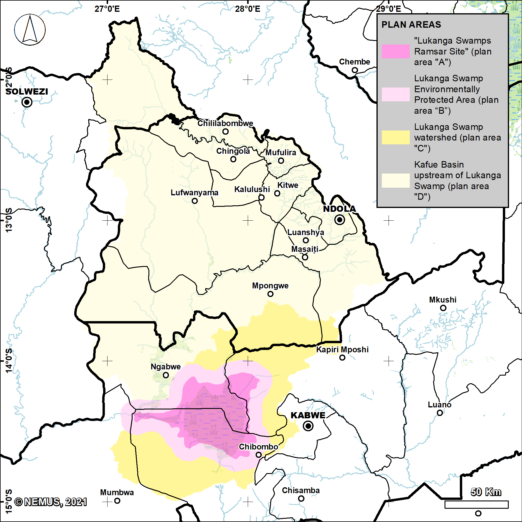 Complementary areas, to take into account the sources of impacts on Lukanga Swamp and its catchment, include Lukanga Swamp watershed (plan area “C”) and Kafue River Basin upstream (plan area “D”).